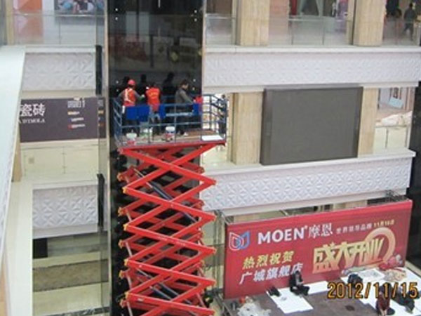 迪邦保潔公司保潔員正在為“廣城家居建材市場(chǎng)”做室內(nèi)觀光電梯外墻清洗。